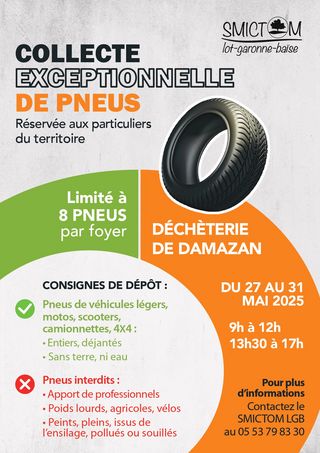 Le SMICTOM LGB organise une collecte exceptionnelle de pneus dans la déchèterie de Damazan sur la semaine du 27 au 31 mai 2025 de 9h à 12h et de 13h30 à 17h.