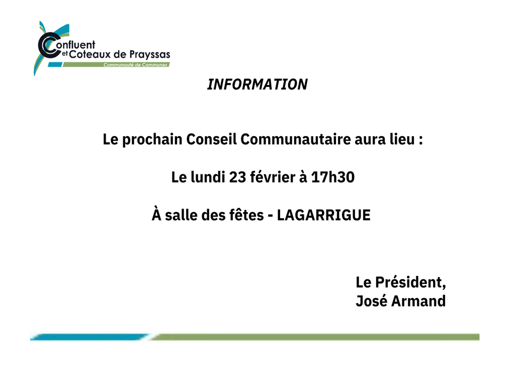 Le Conseil communautaire se réunira le lundi 23 février à 17 h 30 à la Salle des fêtes de Lagarrigue.