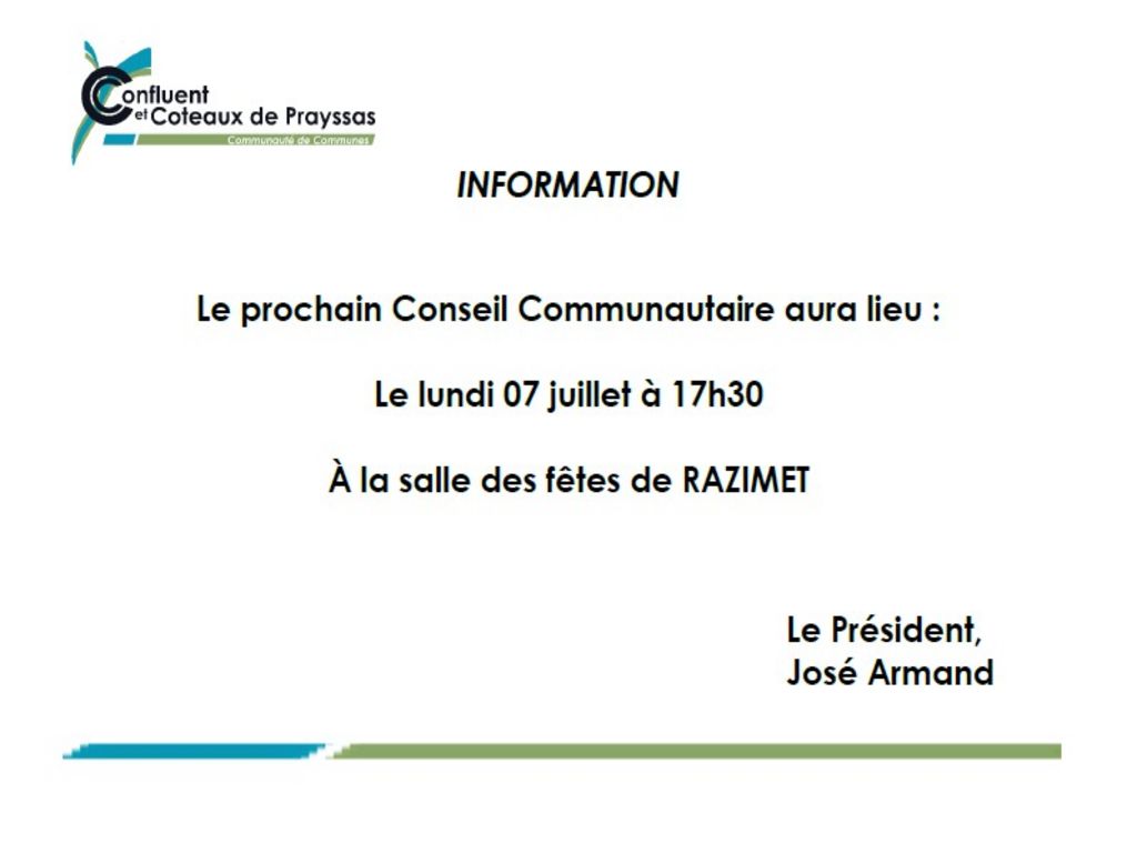 Le prochain Conseil communautaire de la Communauté de communes se tiendra :