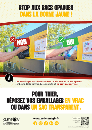 Dans la borne jaune : pas de sac opaque. Le tri se fait en vrac ou dans un sac transparent.